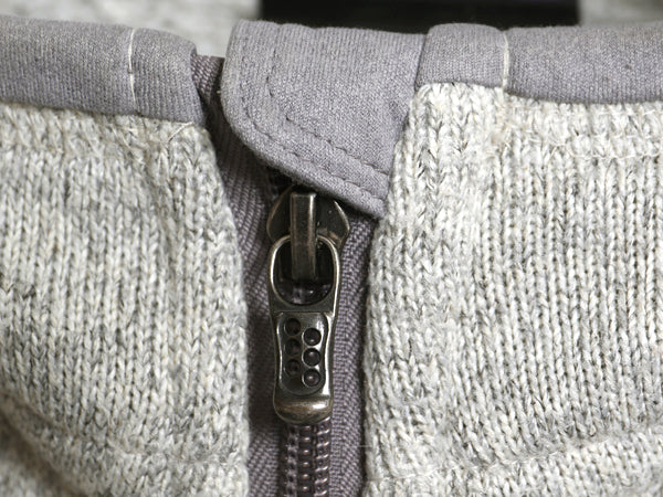 セーターのような見た目とポリエステルの丈夫さを兼ね備え