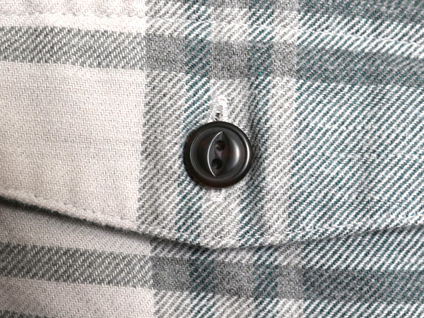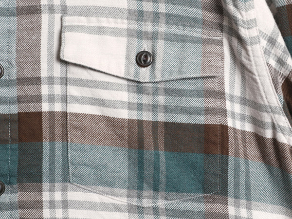 左胸に綺麗な柄合わせが施された、ボタン付きフラップポケット