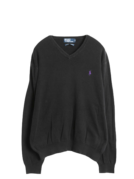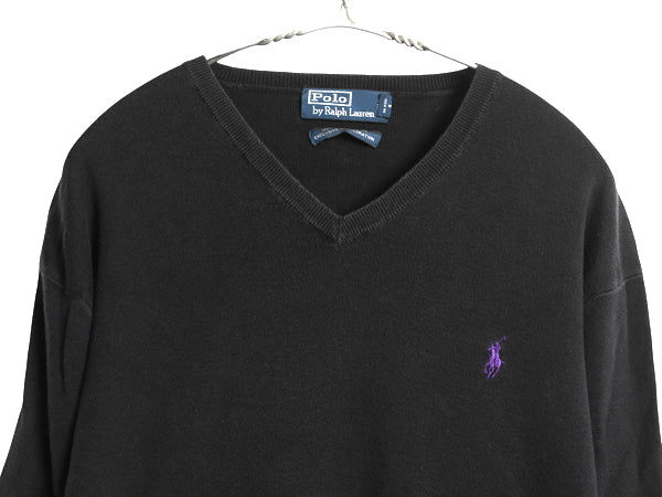 00s ポロ ラルフローレン ニット セーター メンズ L / オールド 長袖ニット 高級 100% ピマ コットン ワンポイント Vネック ハイゲージ 黒