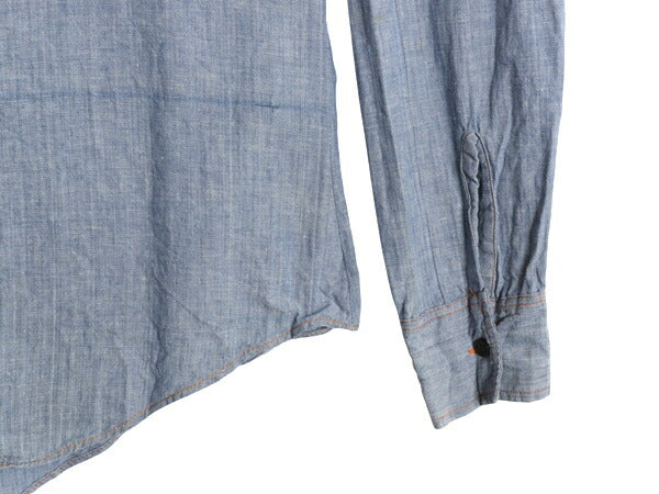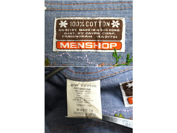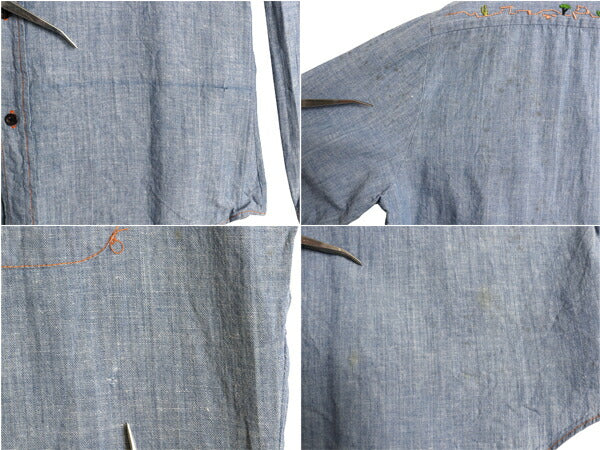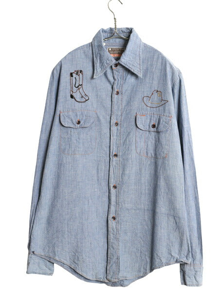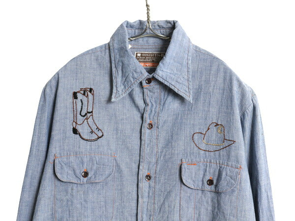 70s ハンドメイド 刺繍 長袖 シャンブレー シャツ メンズ M ヴィテージ ウエスタン 100% コットン 一点物 ポケット付き 長袖シャツ ブルー