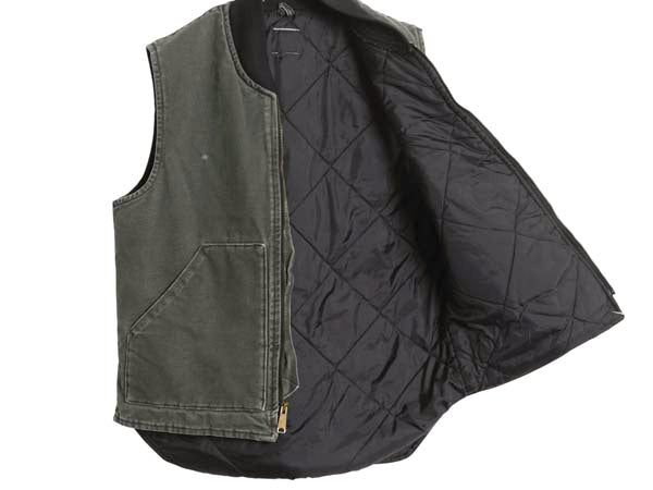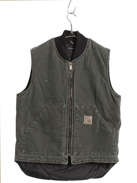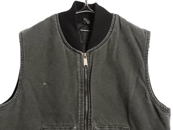 00s カーハート 中綿 ダック ベスト メンズ S 程/ オールド ワーク 腰ゴム ナイロン キルティング ライナー 重ね着 前開き モス グリーン