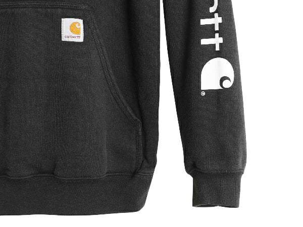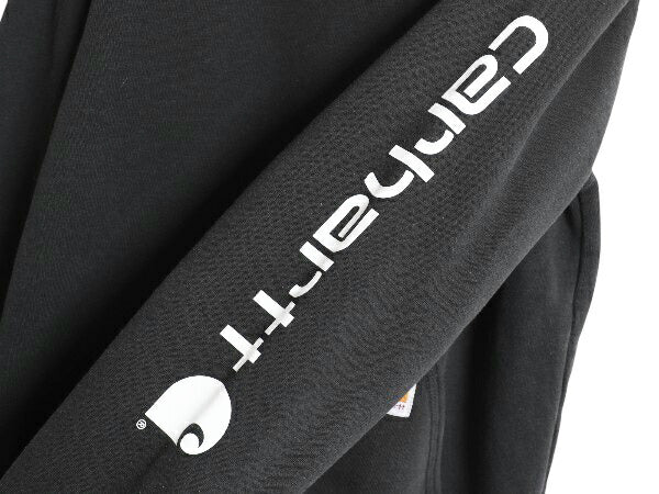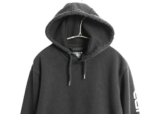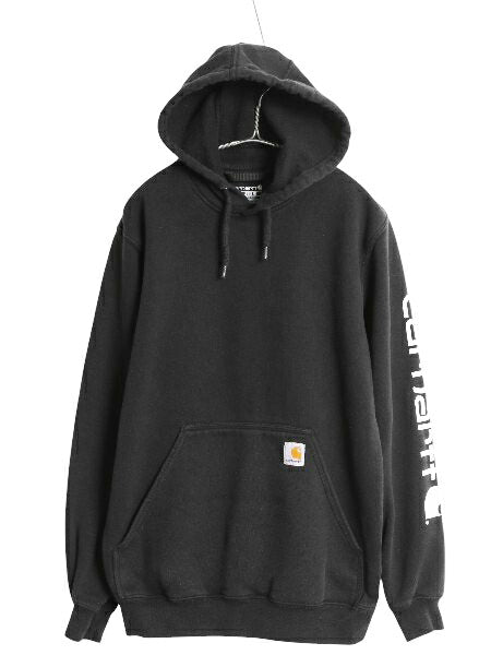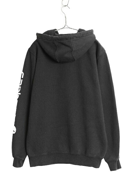 カーハート スウェット フード パーカー メンズ S 古着 袖 ロゴ プリントトレーナー 裏起毛 プルオーバー ミドルウェイト ワンポイント 黒
