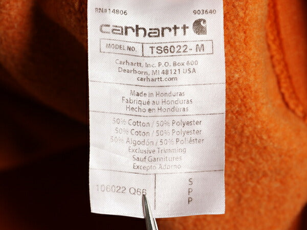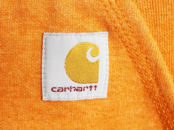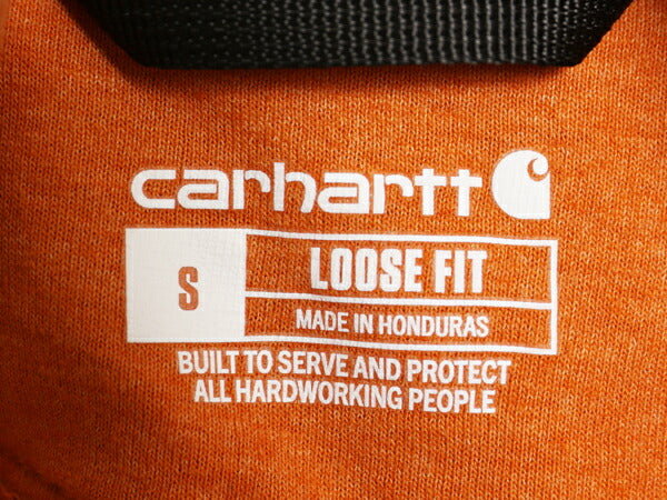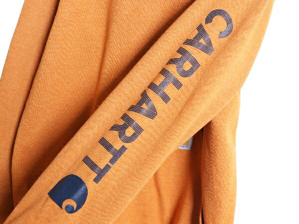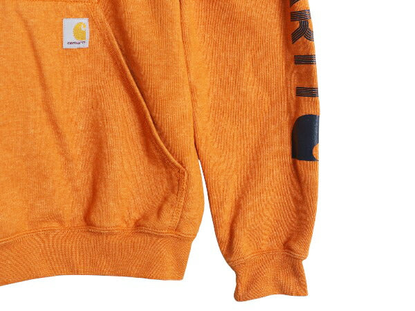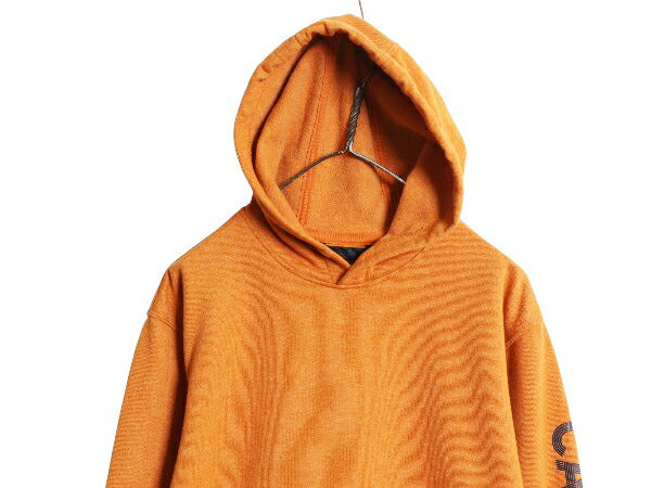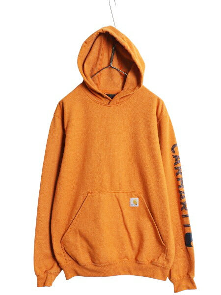 US企画 カーハート スウェット フード パーカー メンズ S 古着 袖 ロゴ プリント トレーナー 裏起毛 プルオーバー ミドルウェイト オレンジ