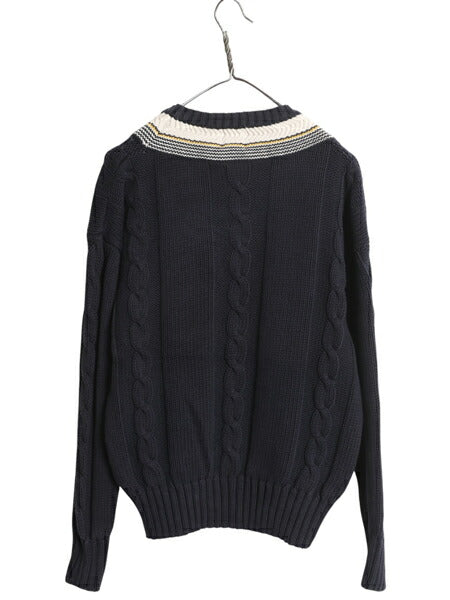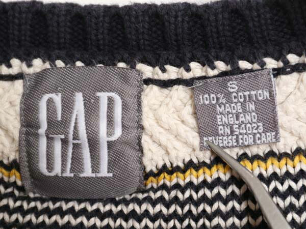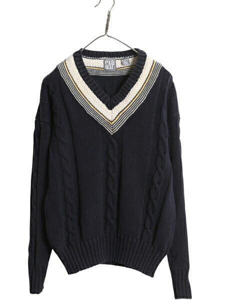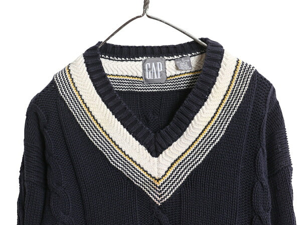 90s イギリス製 オールド ギャップ チルデン ケーブル ニット セーター メンズ レディース S 古着 紺タグ Vネック ヘビーウェイト コットン