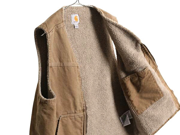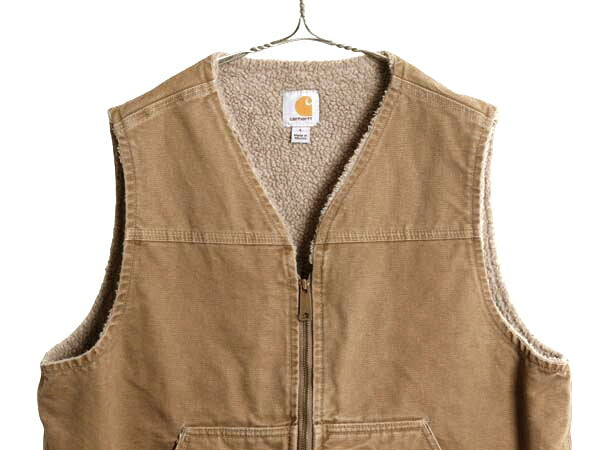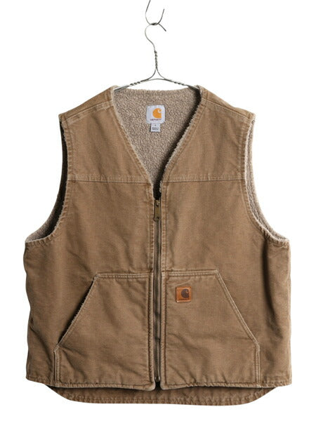 US企画 カーハート ダック ベスト メンズ L 裏 ボア パイル フリース 重ね着 前開き フルジップ ワーク 廃盤 ワンポイント ノースリーブ 茶