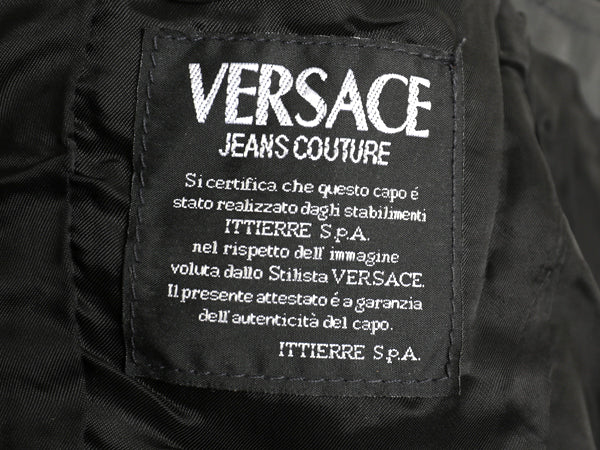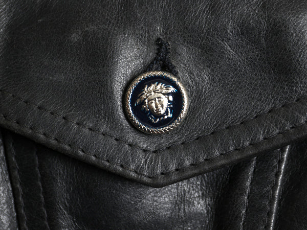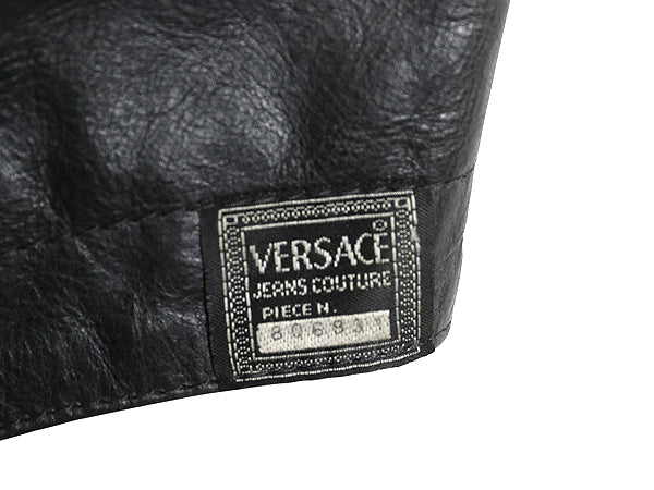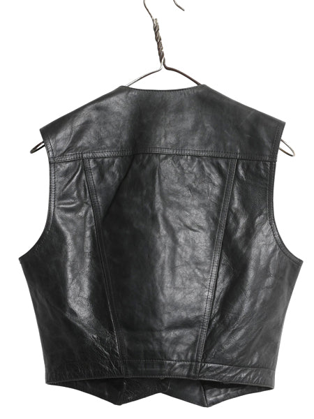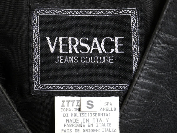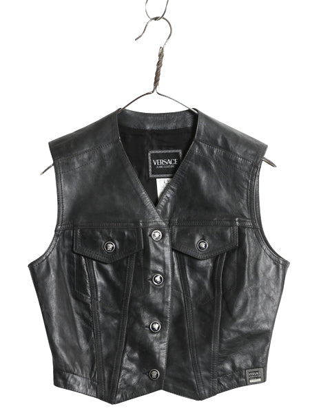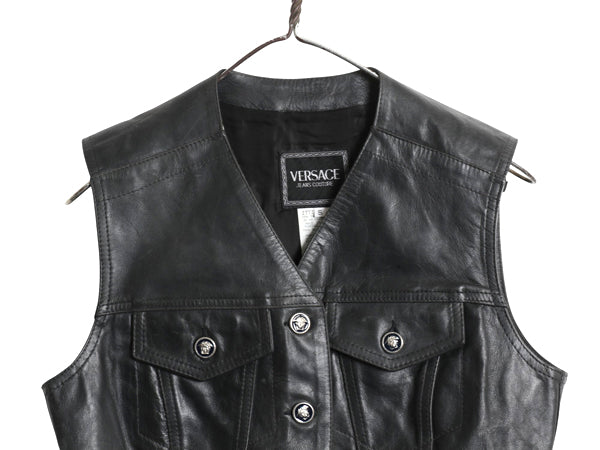 90s イタリア製 ヴェルサーチ 本革 レザー ベスト レディース S 古着 オールド 重ね着 前開き オールレザー ノースリーブ ブラック 当時物