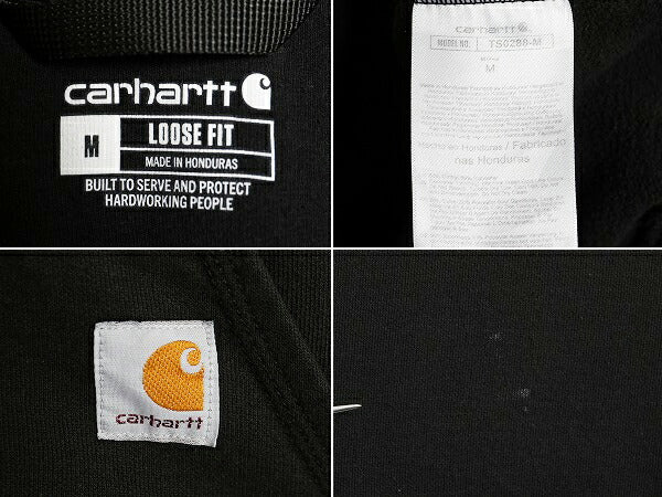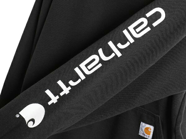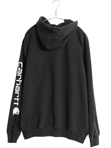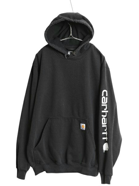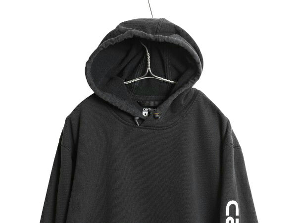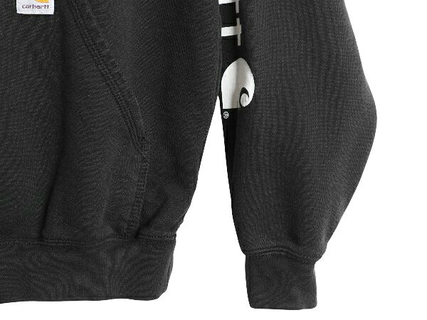 カーハート 袖 プリント スウェット フード パーカー メンズ M 古着 トレーナー 裏起毛 プルオーバー ミドルウェイト ブラック モノトーン