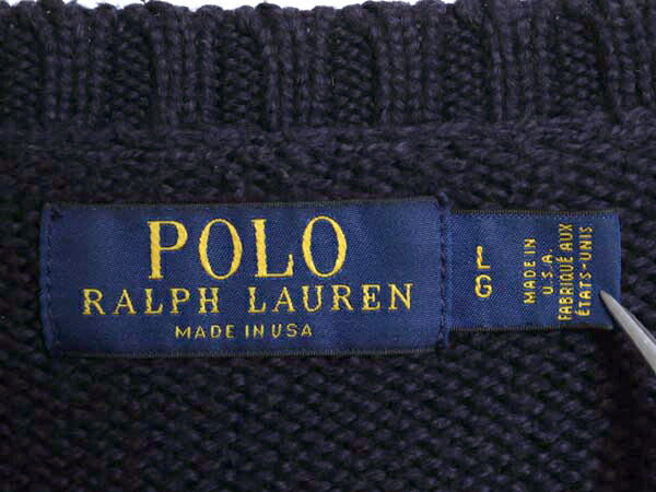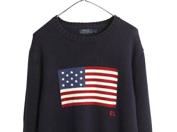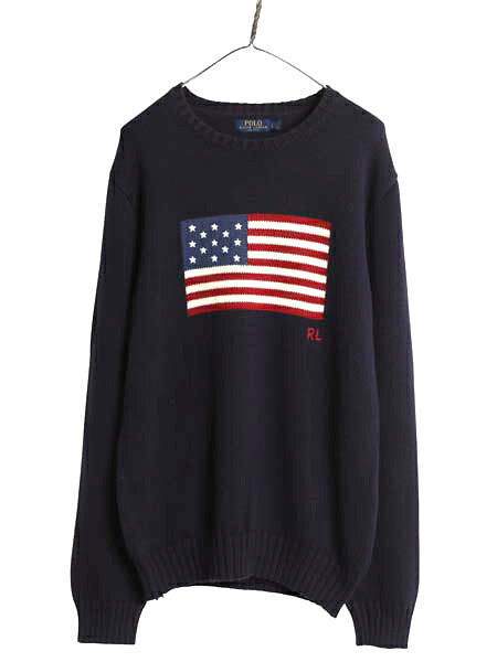 USA製 ポロ ラルフローレン 星条旗 ニット セーターメンズ L 古着 コットン 長袖ニット 長袖セーター クルーネック ミドルゲージ ネイビー