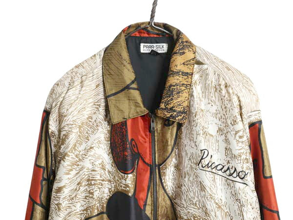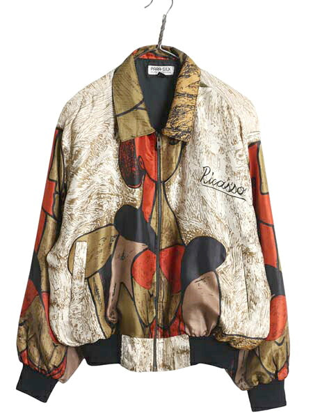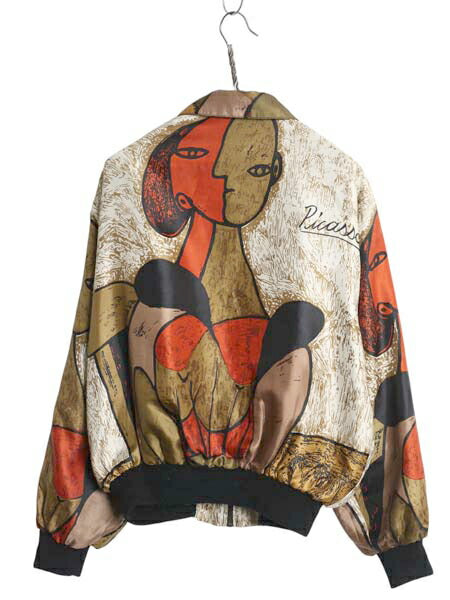 90s ピカソ シルク ジャケット メンズ レディース L 程/ PICASSO オールド アート ボンバー ブルゾン ジャンパー 絵画 総柄 マルチカラー