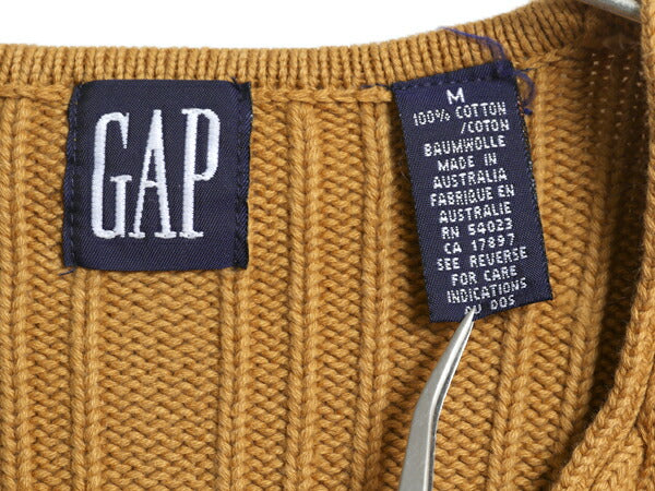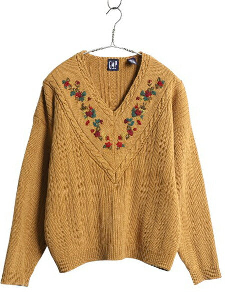 90s オールド ギャップ チルデン ニット セーター レディース M 長袖ニット 花 刺繍 ヘビーウェイト コットン リブ編み ダーク マスタード