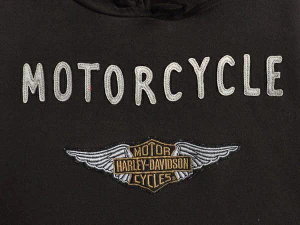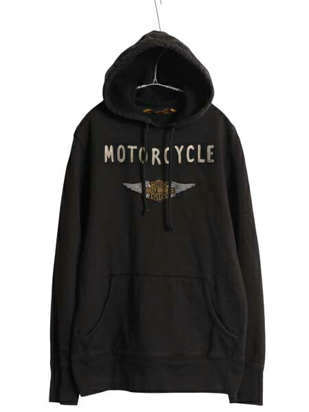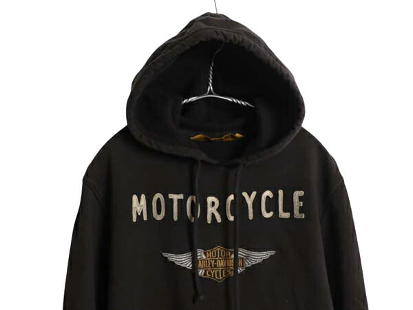 ハーレー ダビッドソン フェルト ロゴ 刺繍 スウェット フード パーカー メンズ M ヴィンテージ モデル プルオーバー トレーナー バイク 黒