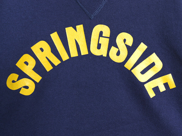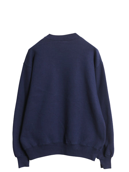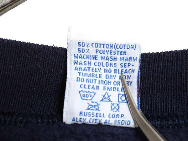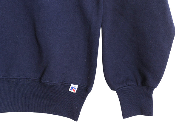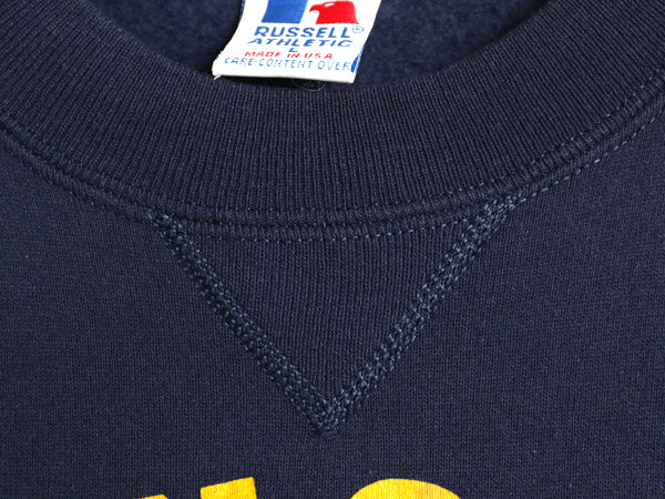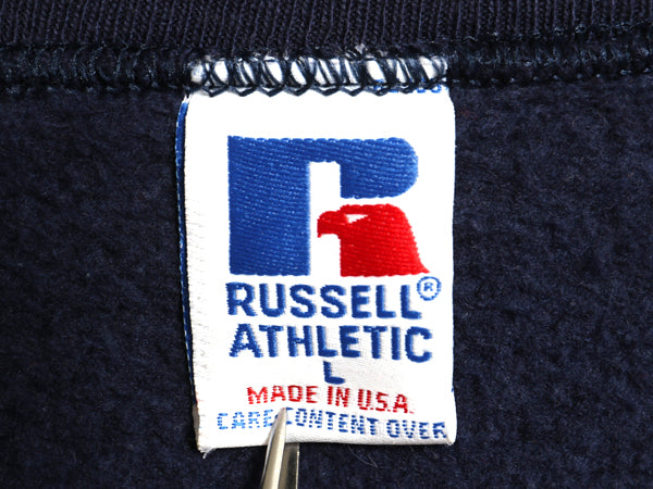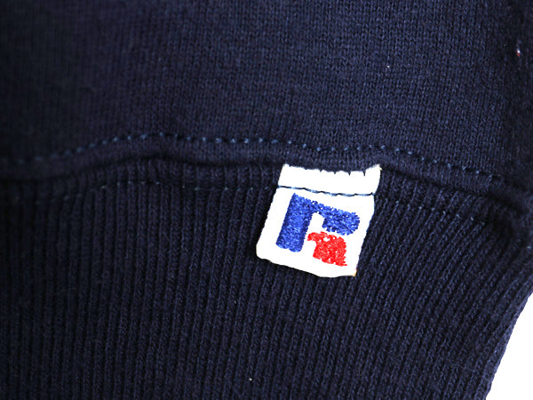 90s USA製 ラッセル プリント スウェット メンズ レディース L オールド トレーナー 前V 裏起毛 クルーネック シンプル ゆったり ネイビー