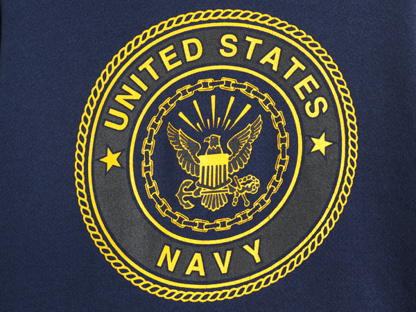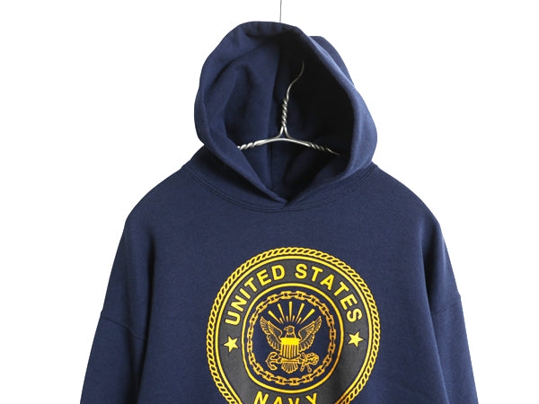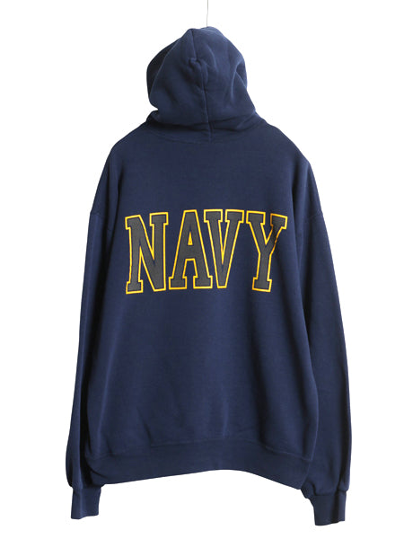 90s USA製 US NAVY 両面 プリント スウェット フード パーカー メンズ L / 古着 オールド ミリタリー トレーナー 裏起毛 軍物 ネイビー USN