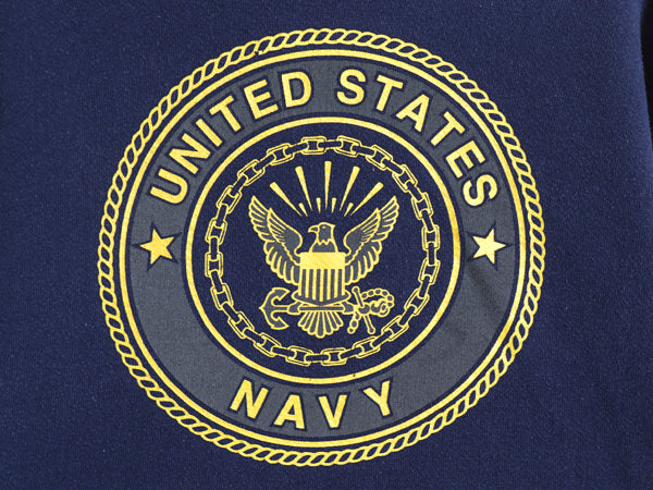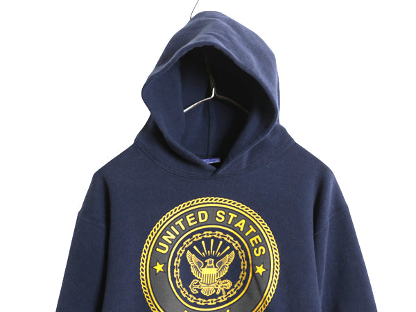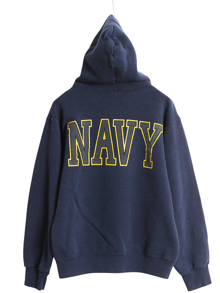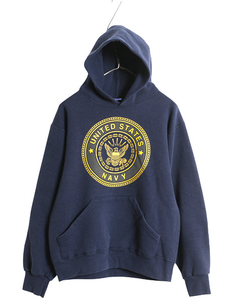 90s USA製 US NAVY 両面 プリント スウェット フード パーカー メンズ S / 古着 オールド ミリタリー トレーナー 裏起毛 軍物 ネイビー USN