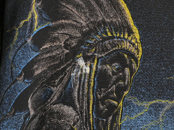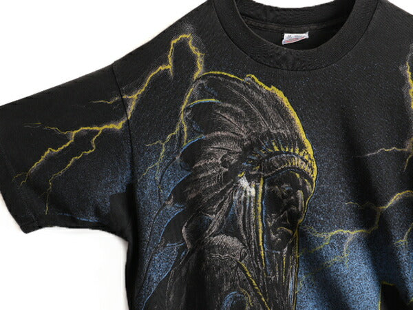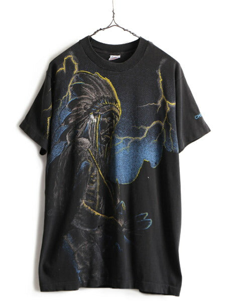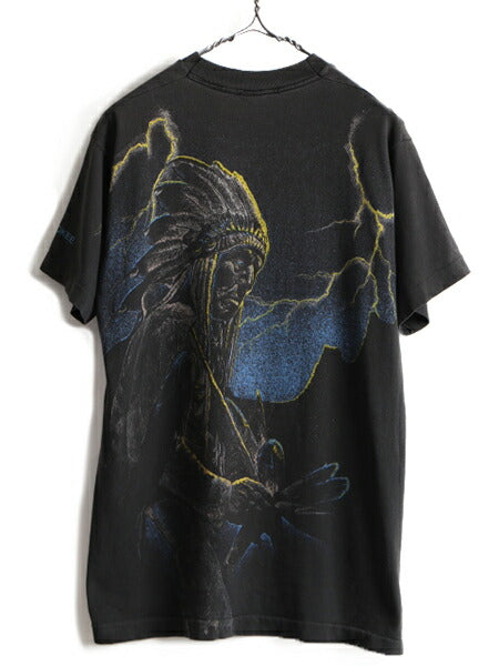 90s USA製 ★ インディアン 大判 オーバー プリント 半袖 Tシャツ ( メンズ M ) 古着 90年代 ネイティブアメリカン シングルステッチ 黒