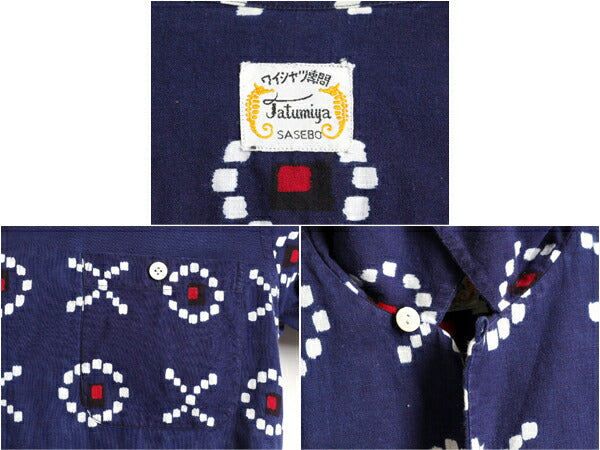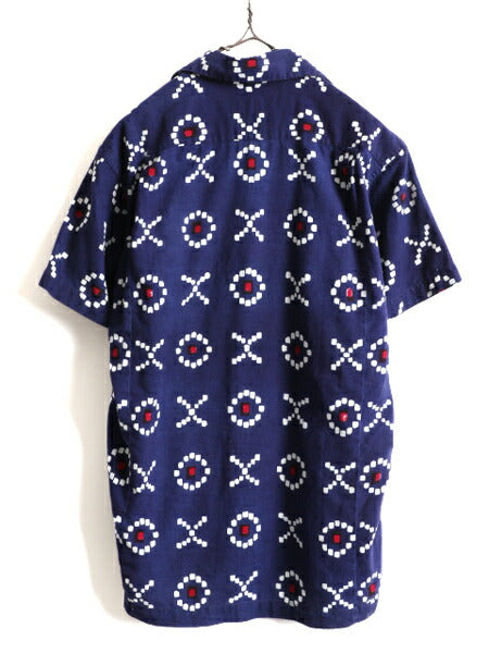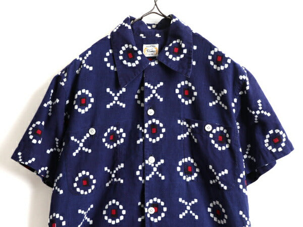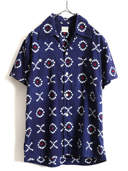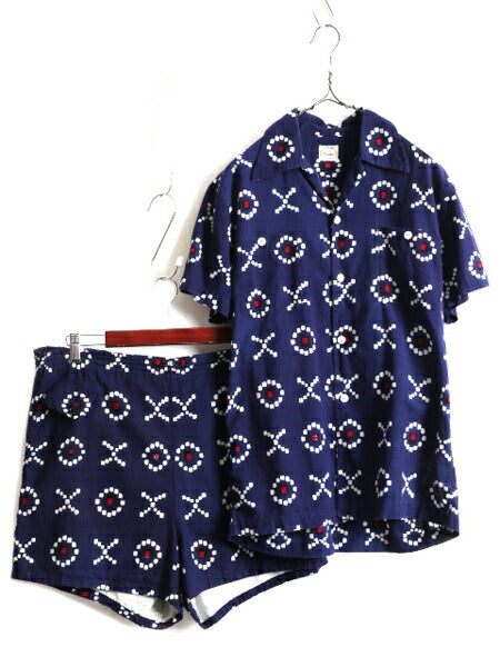 40s 50s 日本製 セットアップ ★ スーベニア ループ留め オープンカラー 半袖 シャツ メンズ M / 和柄 総柄 開襟 コットン ショーツ パンツ