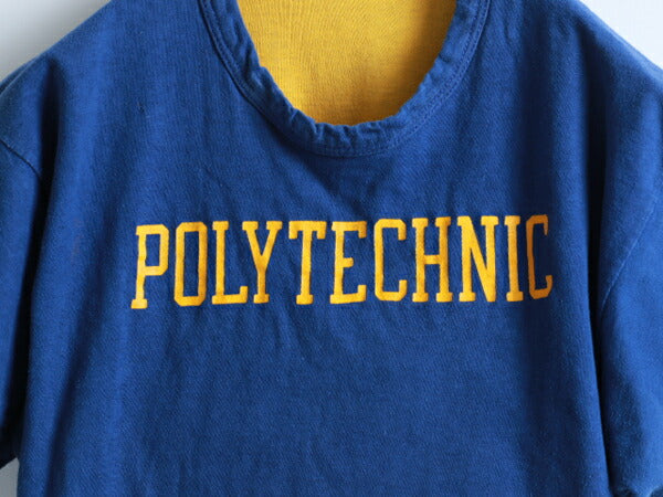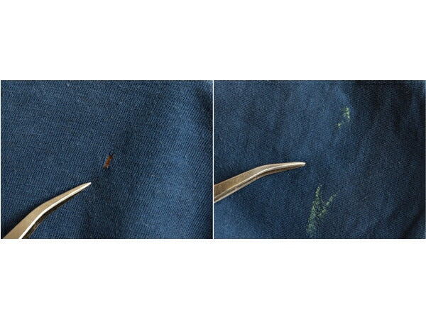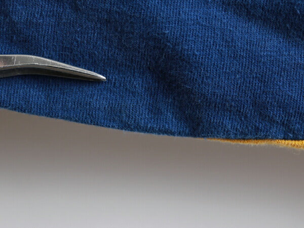 コンディションは全体的な色褪せ、ブルー側のフロント裾に薄汚れ、右袖にペンキ跡、イエロー側のプリント下にシミ、裏表のプリント上と右肩の同じ場所に恐らく引っ掛けによるピンホールがあります。
