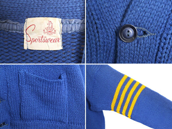 40s 50s ★ ウール レタード ニット カーディガン メンズ L 程/ 古着 40年代 50年代 ヴィンテージ リブ長 パチポケ アワード セーター 青