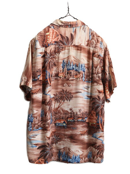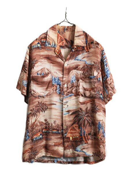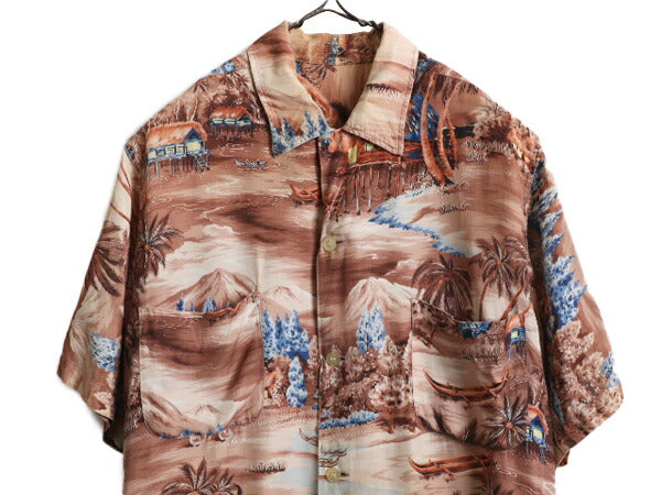 60s ★ ループ留め オープンカラー レーヨン アロハ シャツ メンズ M 程 古着 60年代 ヴィンテージ ハワイアン 開襟 ボックス ポケット付き