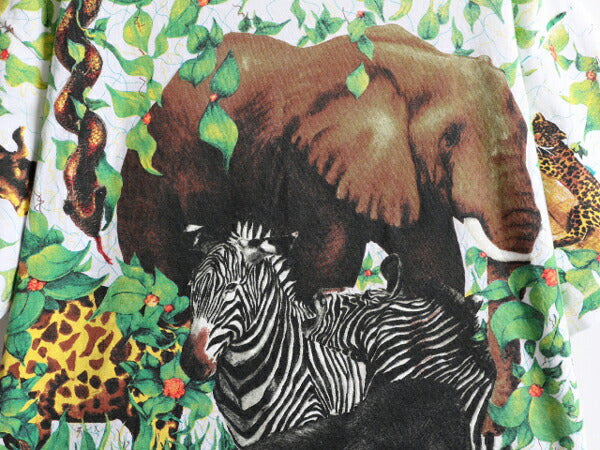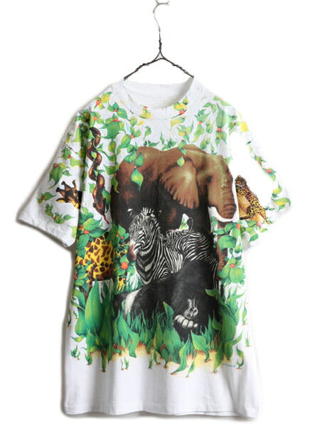 デッドストック 90s ★ WILD ORTS アニマル オールオーバー プリント Tシャツ メンズ XL / 白 イラスト アート 動物 花 シングルステッチ