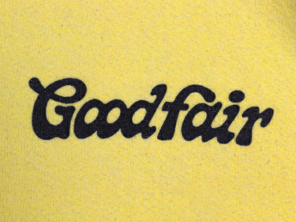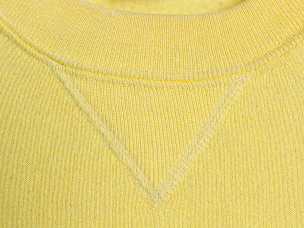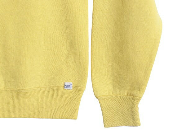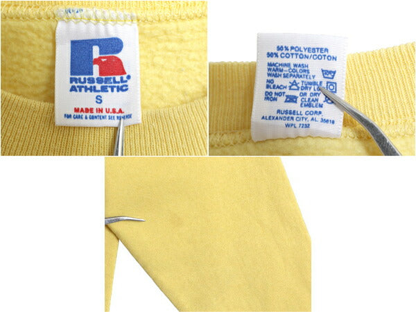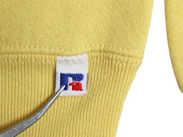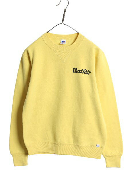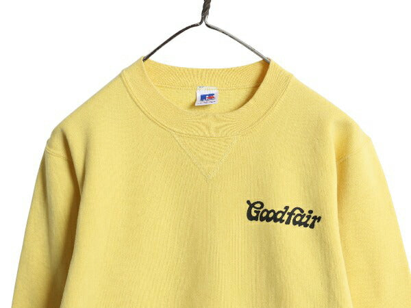 80s USA製 ラッセル プリント スウェット メンズ レディース S 古着 ヴィンテージ トレーナー 前V 裏起毛 ワンポイント 企業 ロゴ イエロー